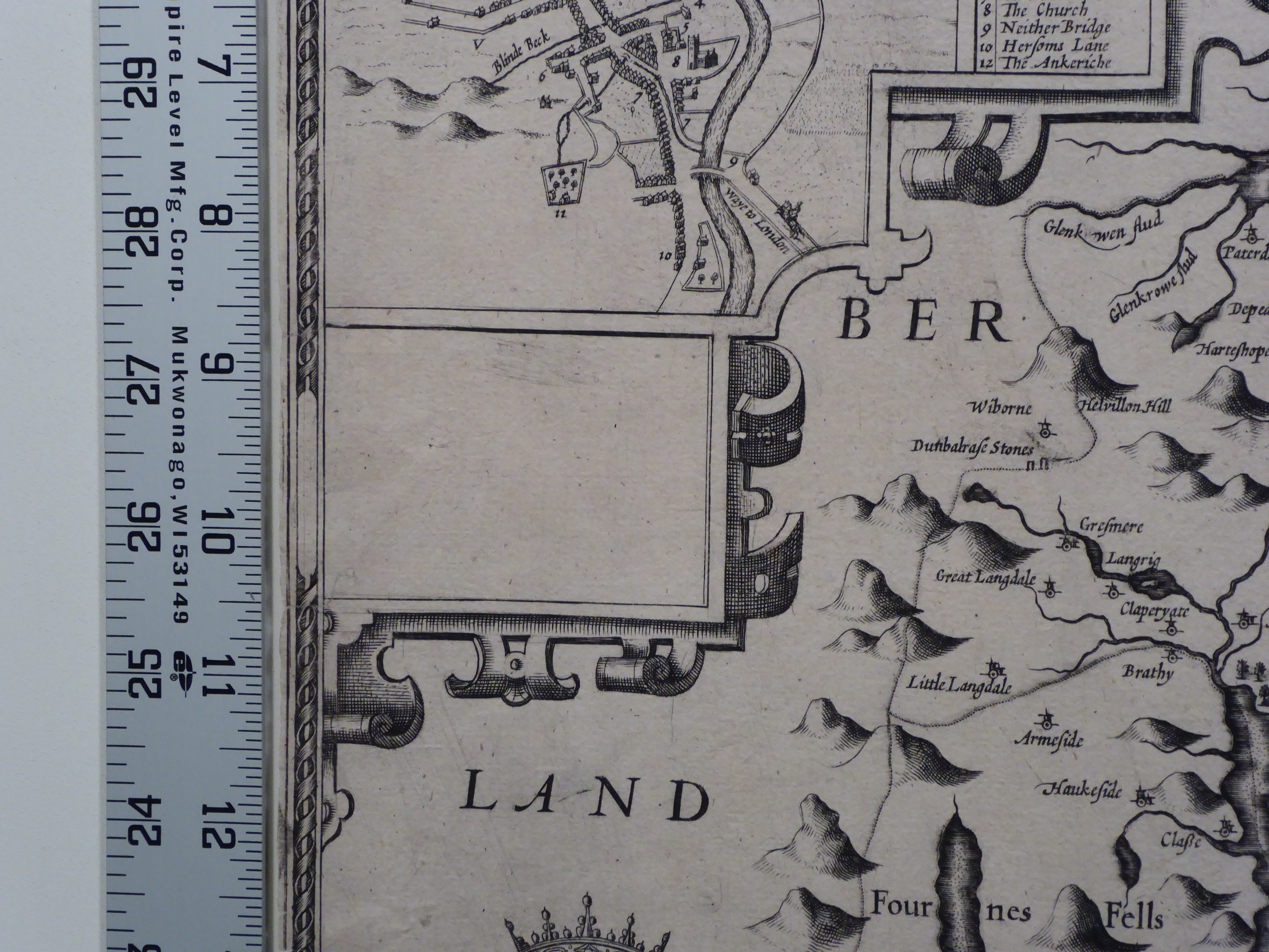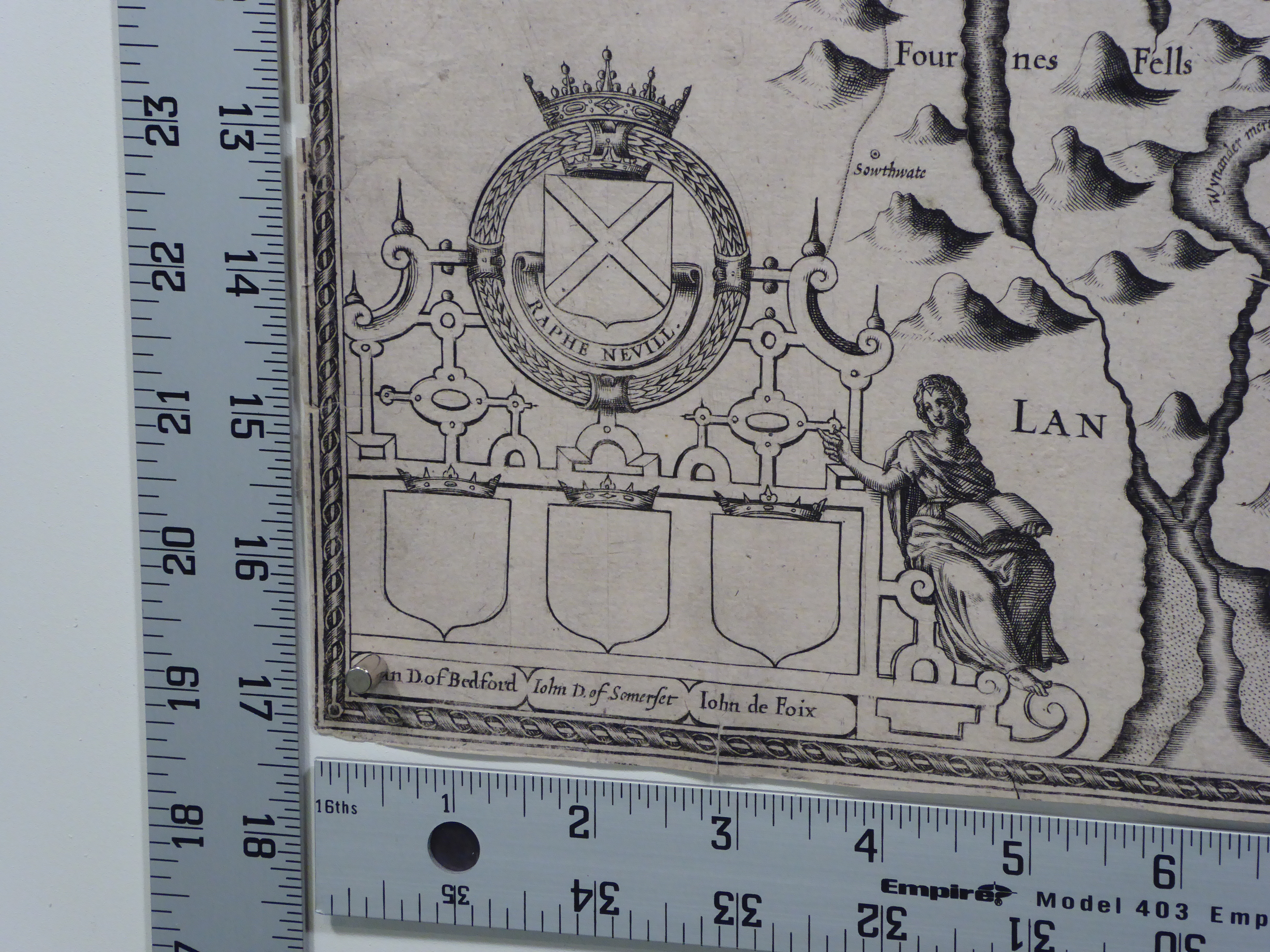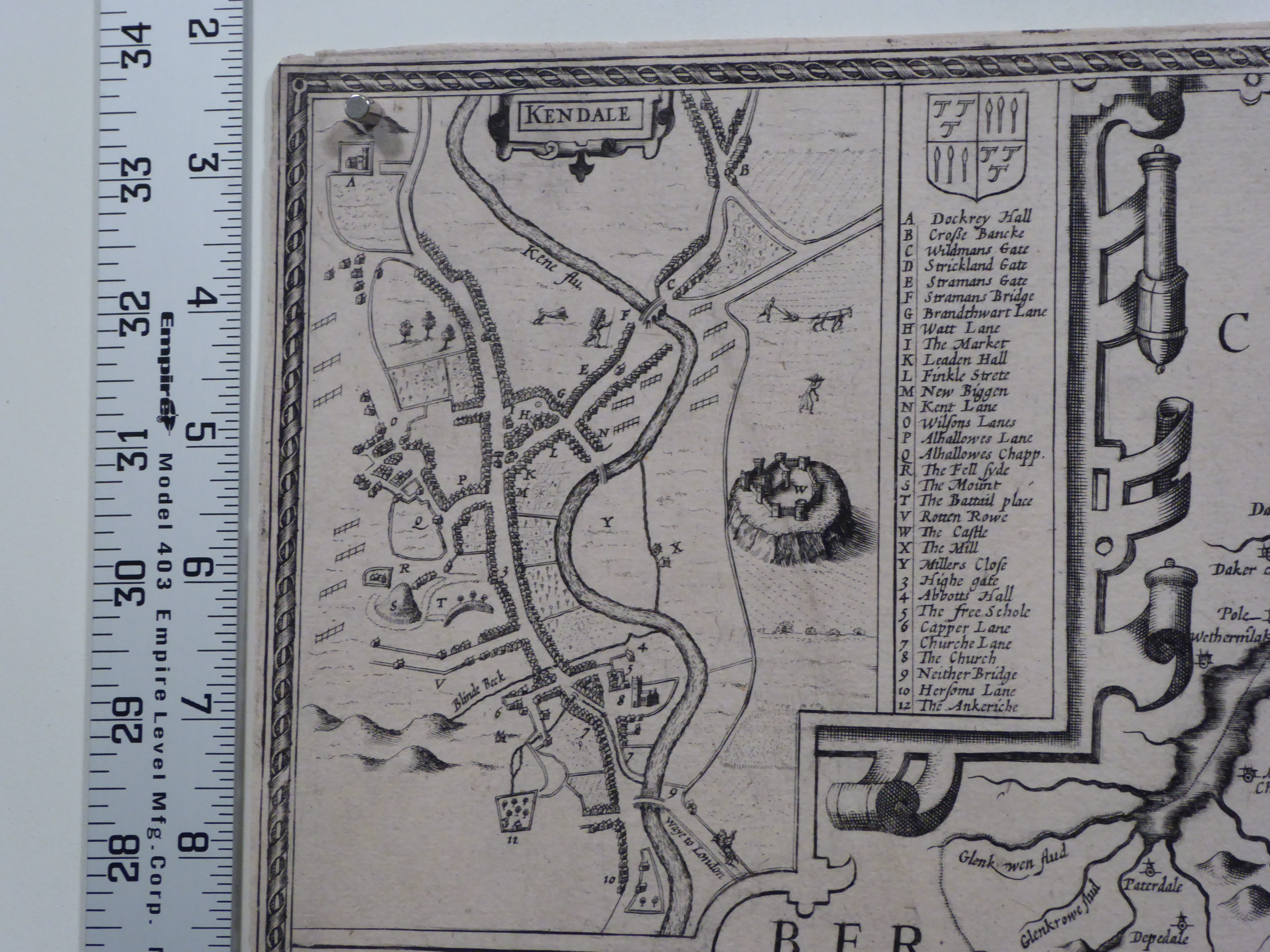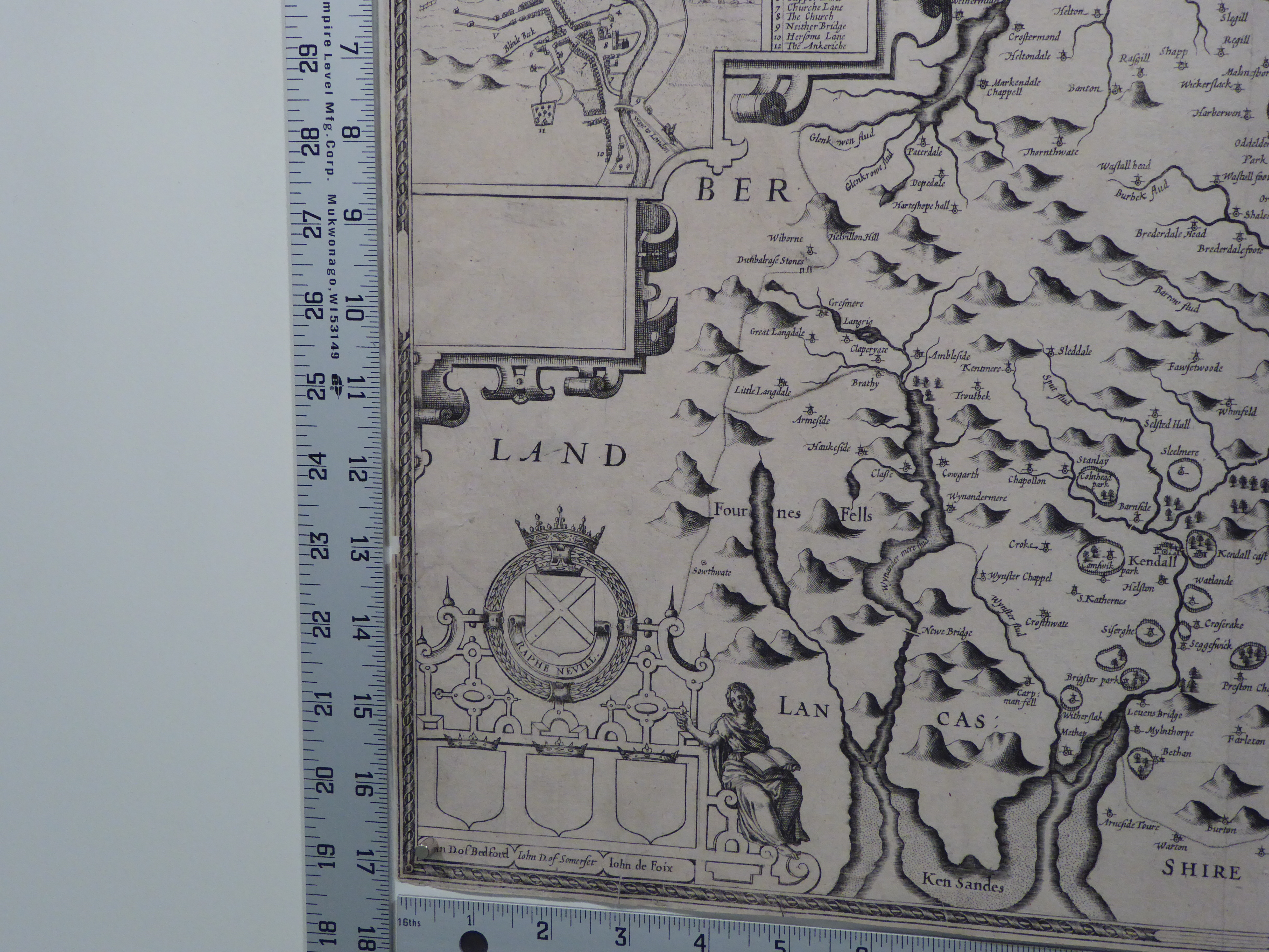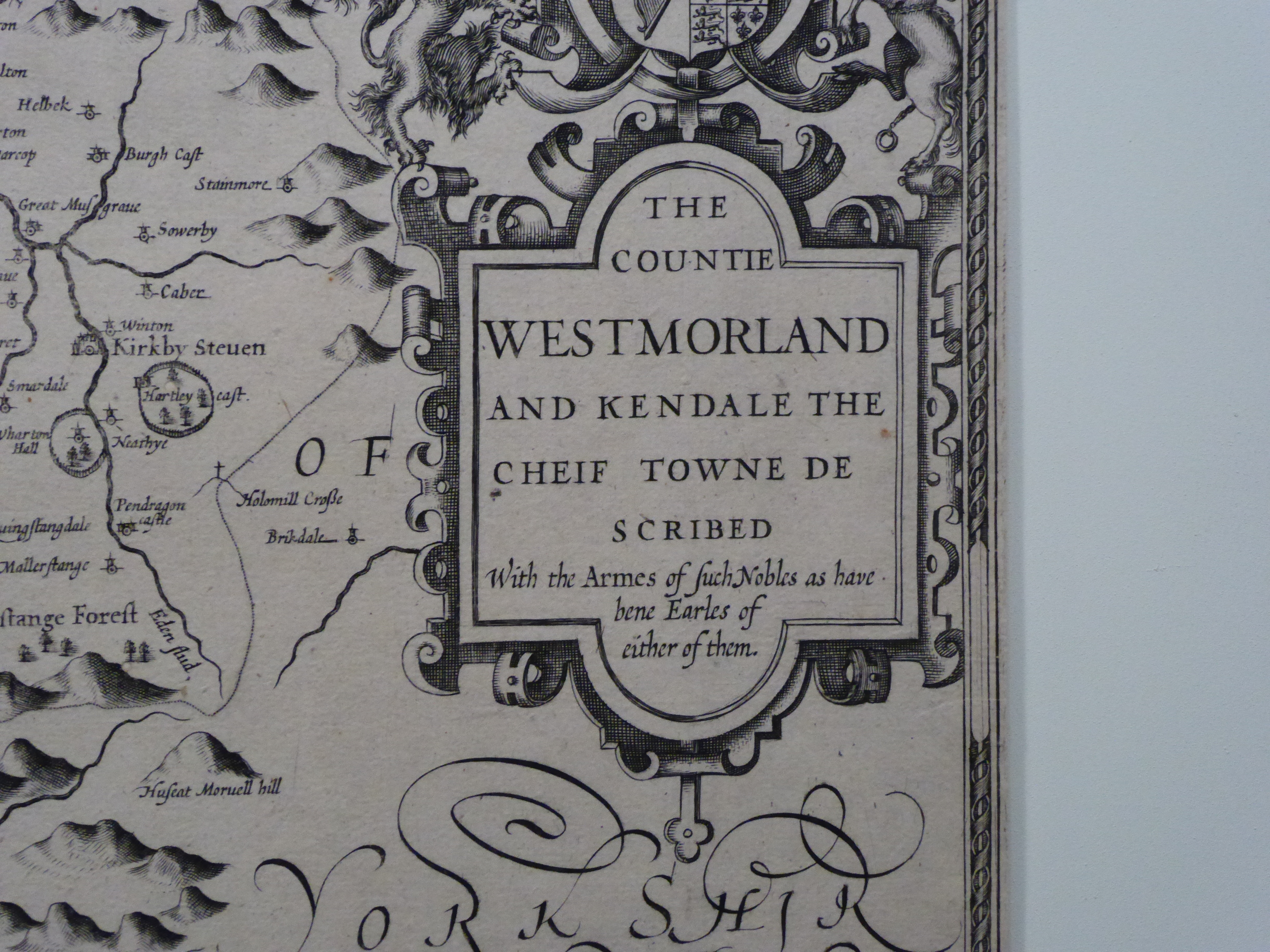 THE / COUNTIE / WESTMORLAND / AND KENDALE THE / CHEIF TOWNE DE / SCRIBED / With the Armes of such Nobles as have bene Earls of either of them. C1