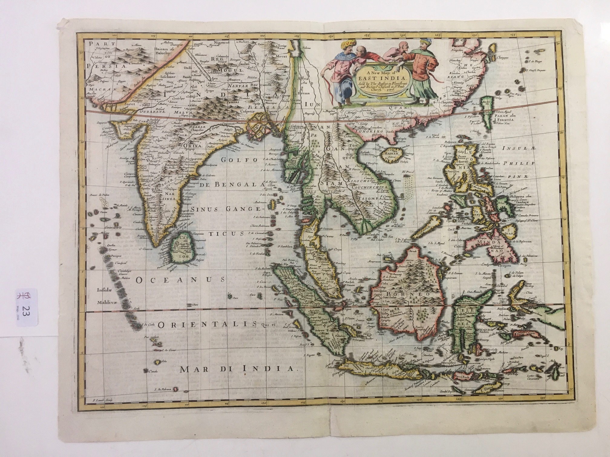 A New Map of / EAST INDIA. / Sold by Tho: Basset in Fleet Street. / and Richard Chiswell in St. Pauls / Church yard.