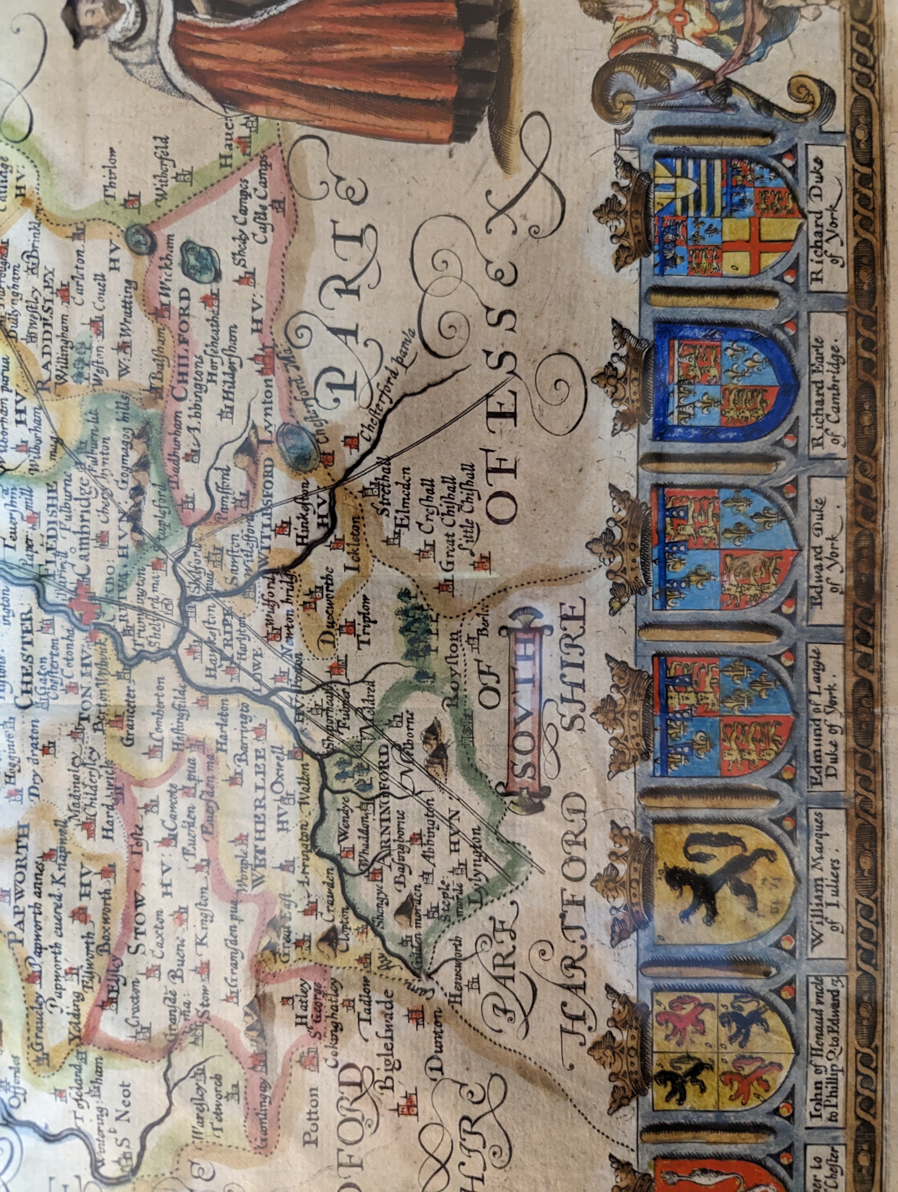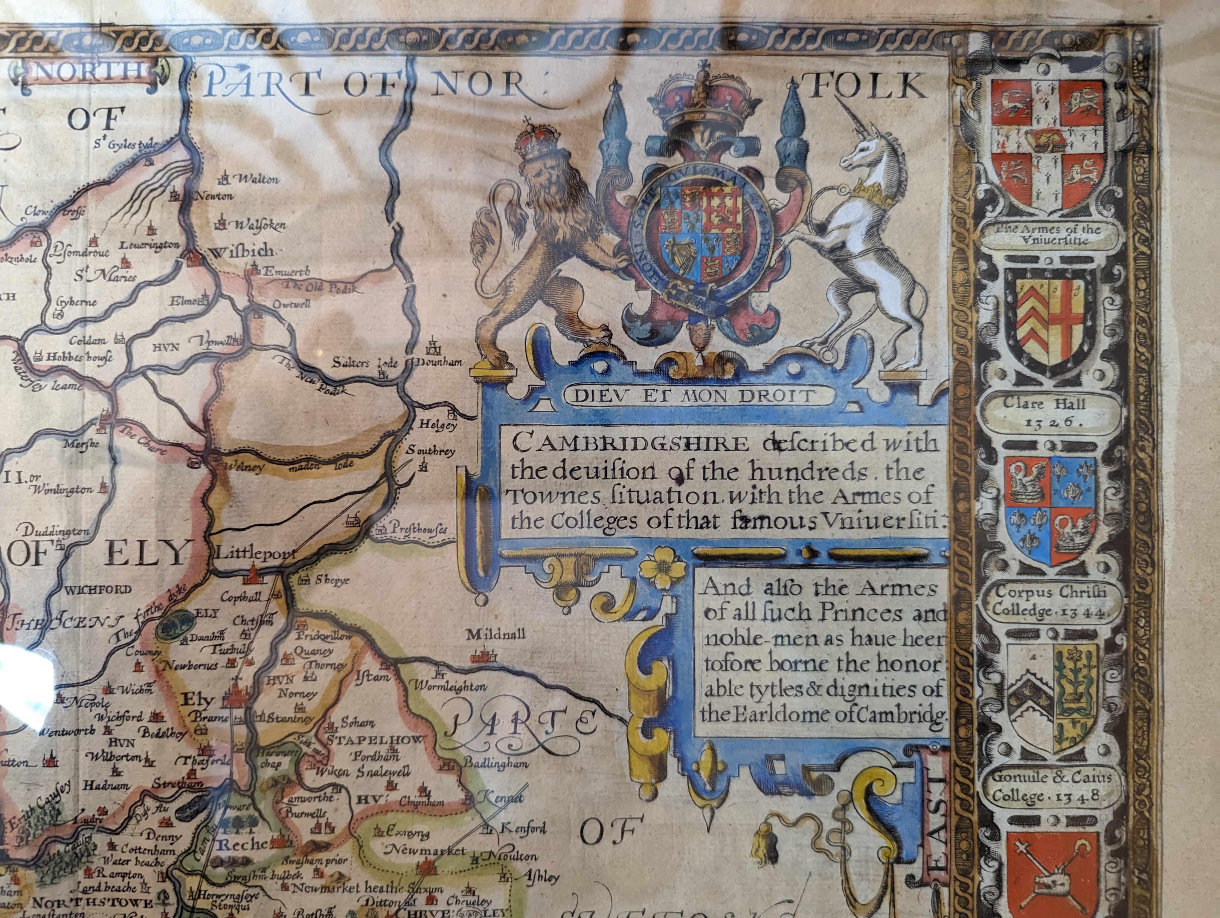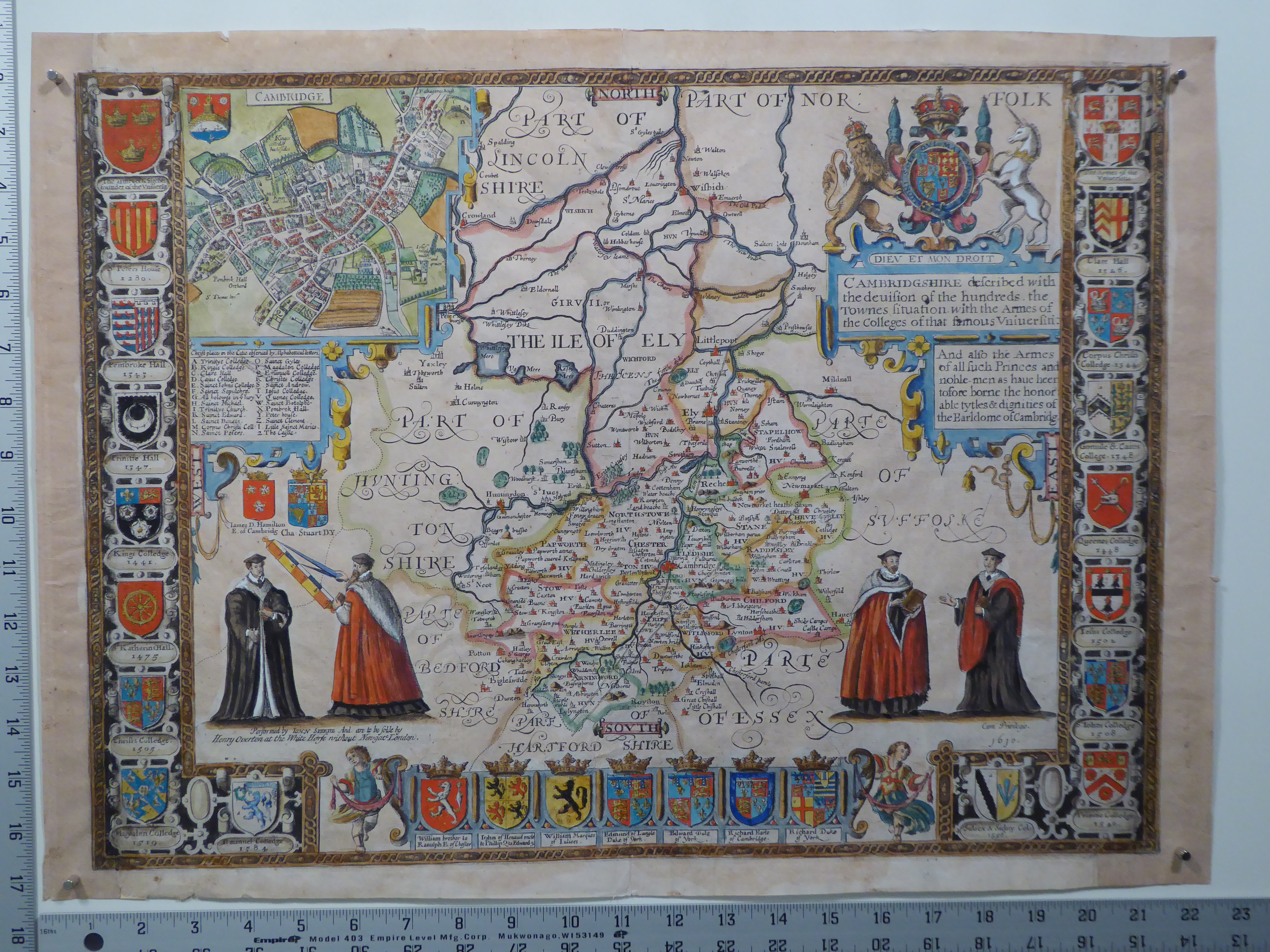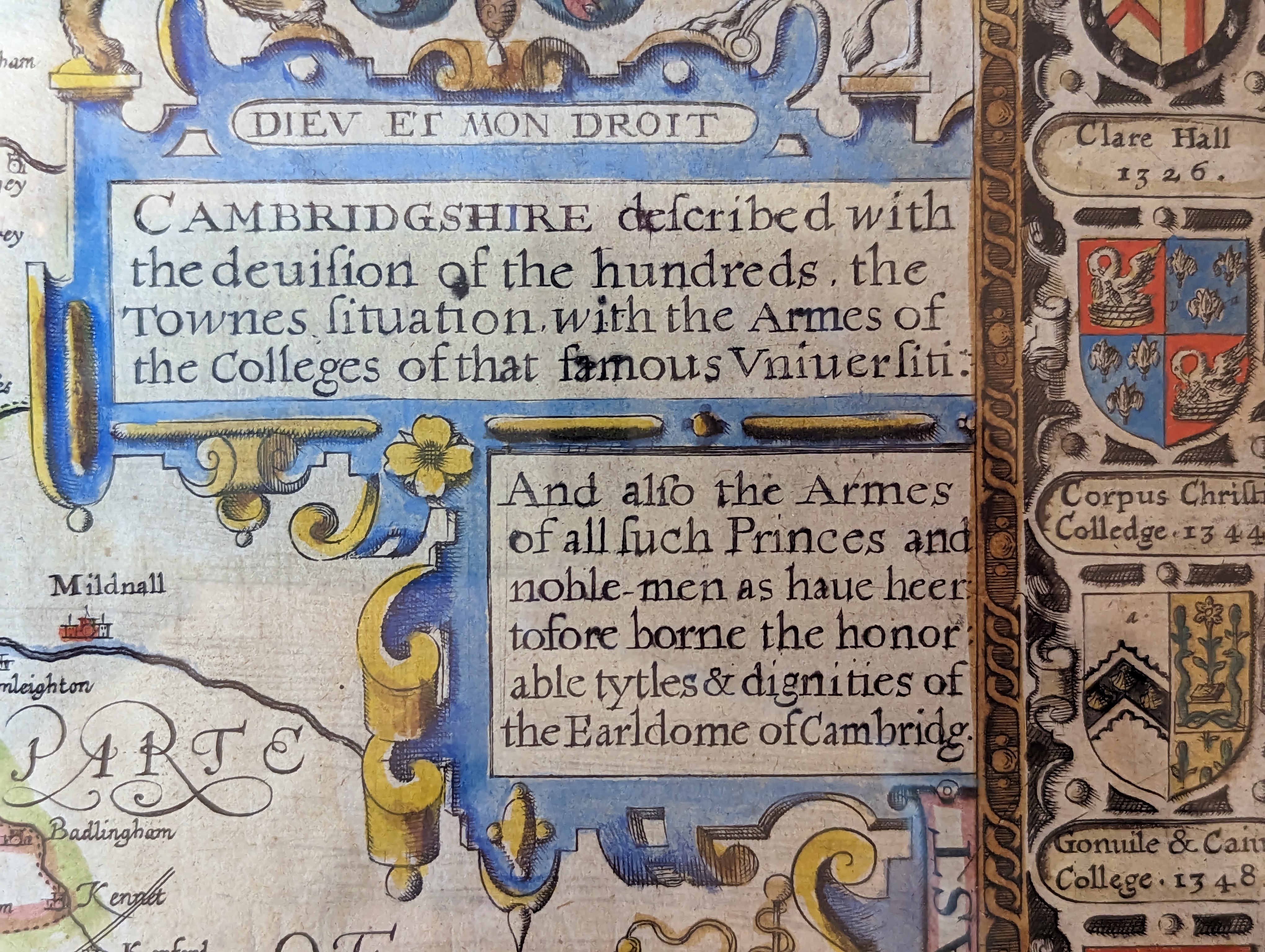 CAMBRIDGSHYRE described with / the deuision of the hundreds, the / Townes situation, with the Armes of / the Colleges of that famous Vniuersiti.