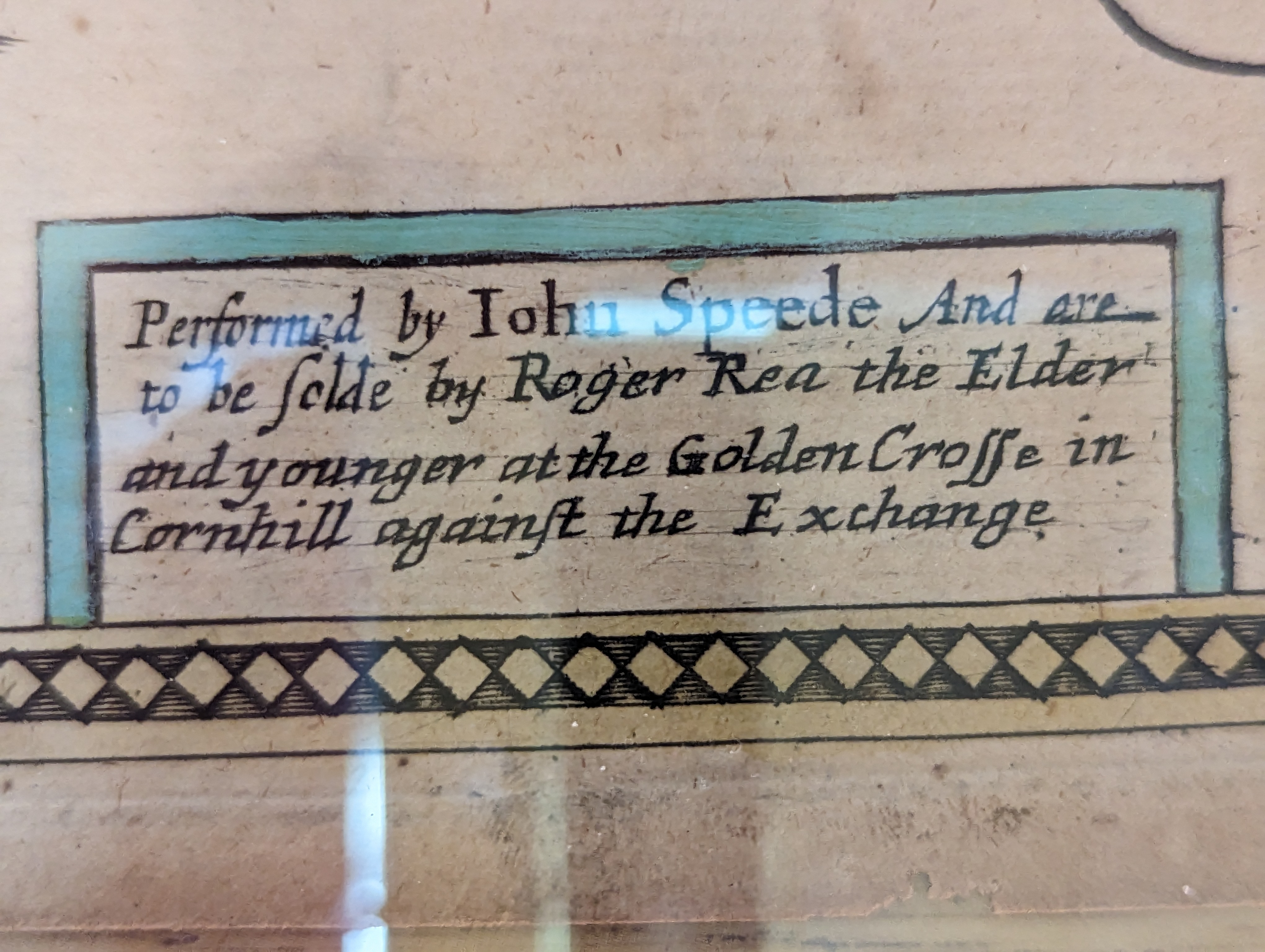 Performed by Iohn Speede And are / to be Solde by Roger Rea the Elder and younger at the Golden Crosse in Cornhill against the Exchange