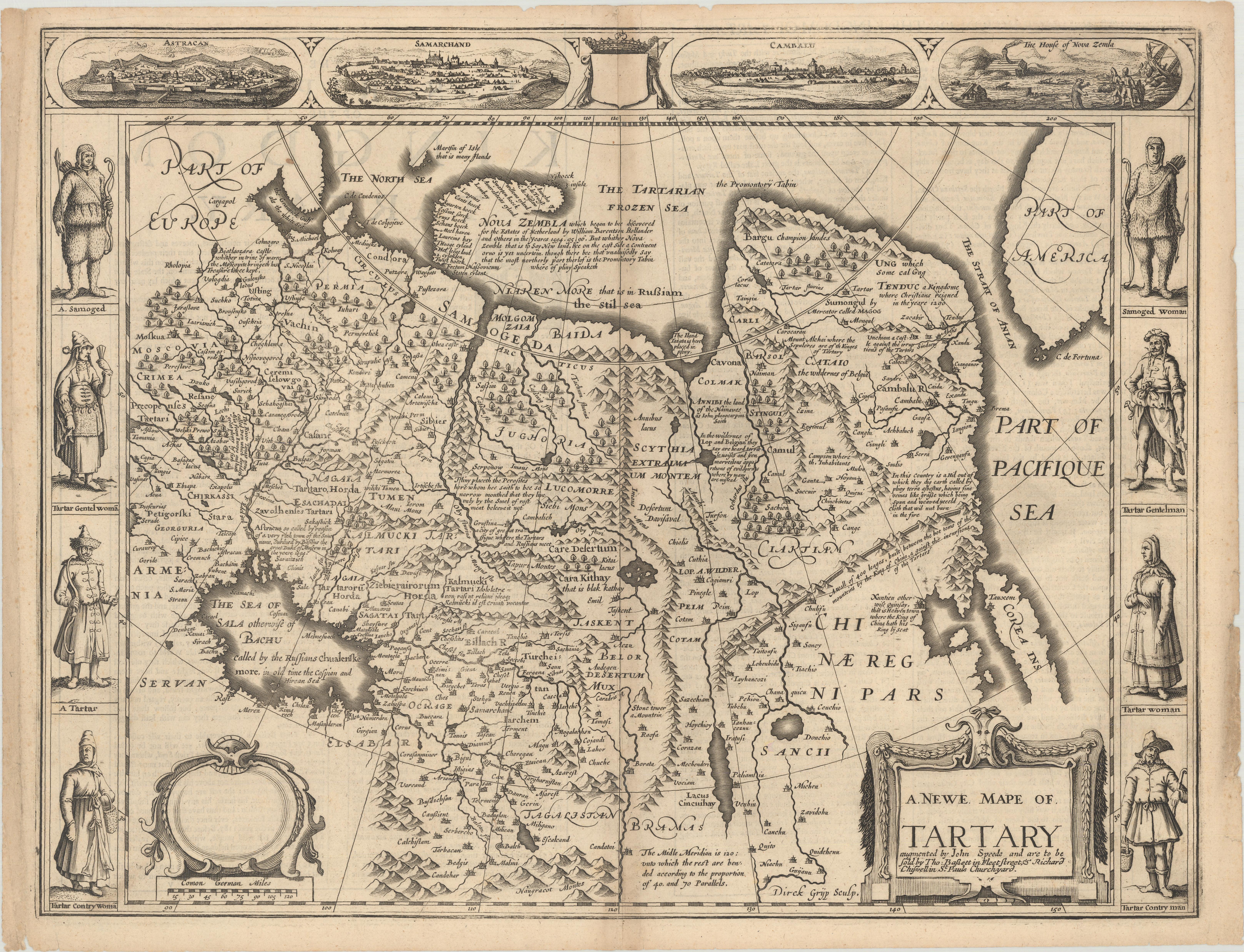A NEWE MAP OF / TARTARY / augmented by John Speede and are to be / Sold by Tho Basset in Fleet Street, & Richard / Chiswell in St. Pauls Churchyard.