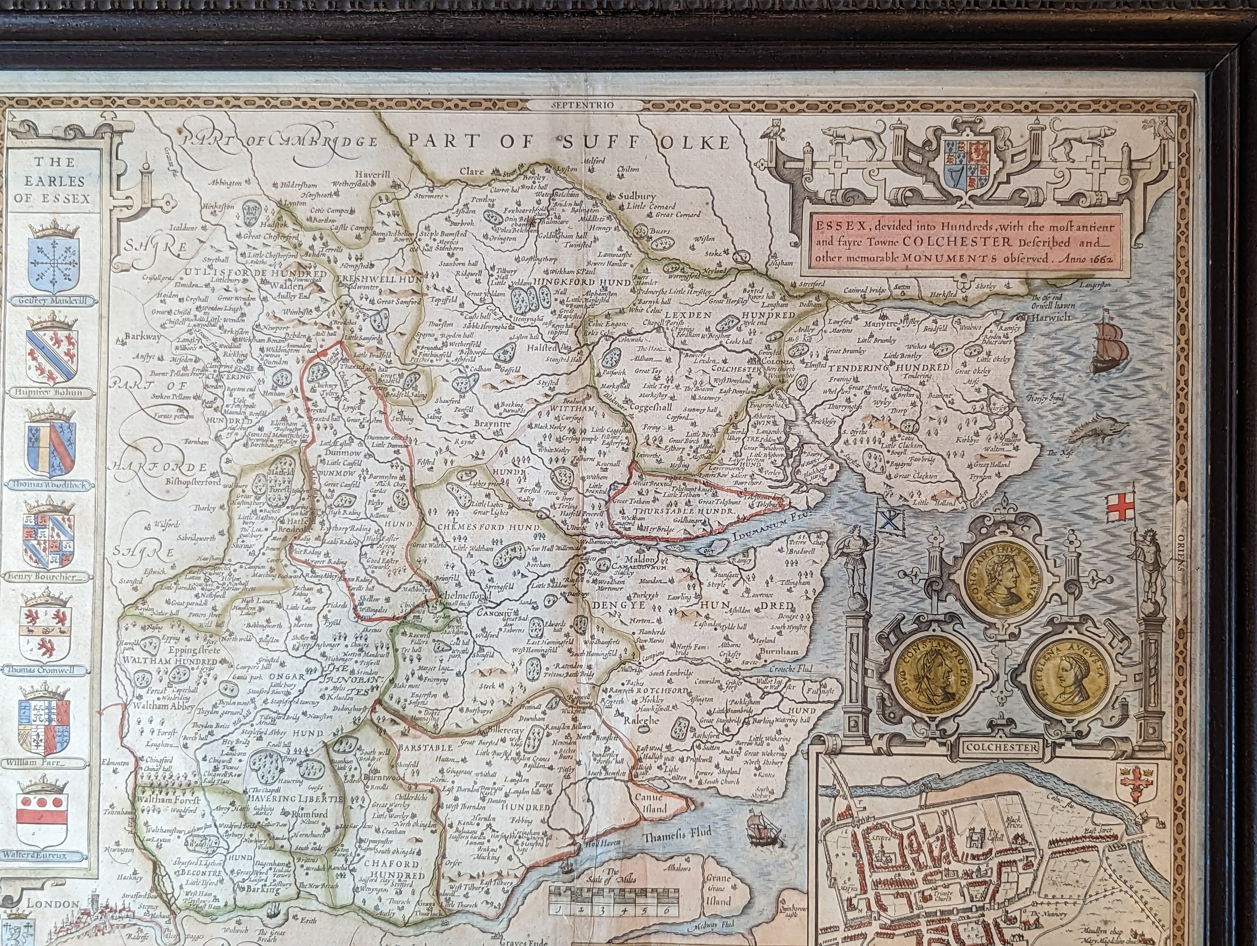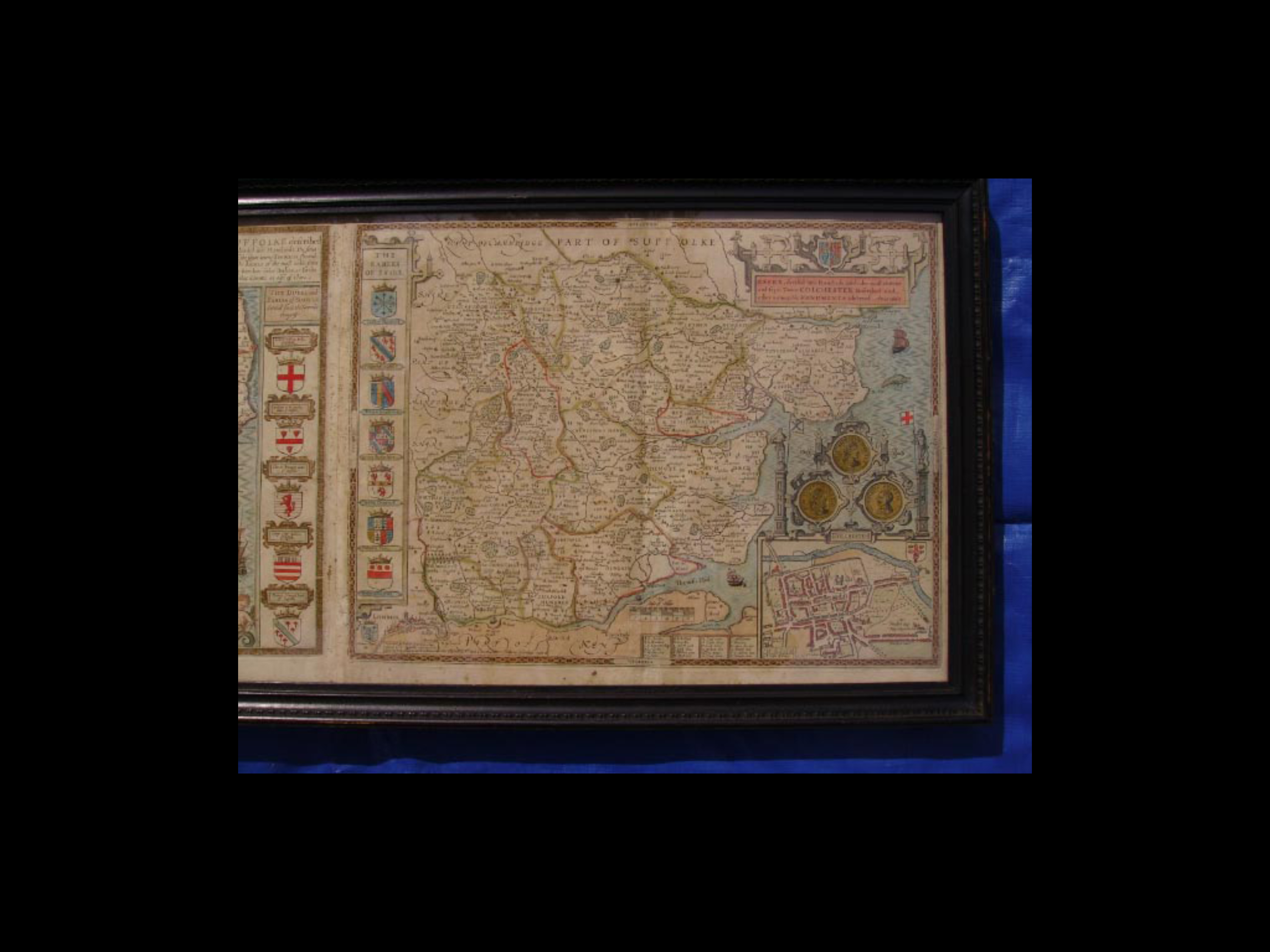 SUFFOLKE described / and divided into Hundreds, The Situa : / tion of the fayre towne Ipswich Shewed, / with the Armes of the most noble fami: / lies that have bene either Dukes, or Earles / both of that Countie as also of Cla're.