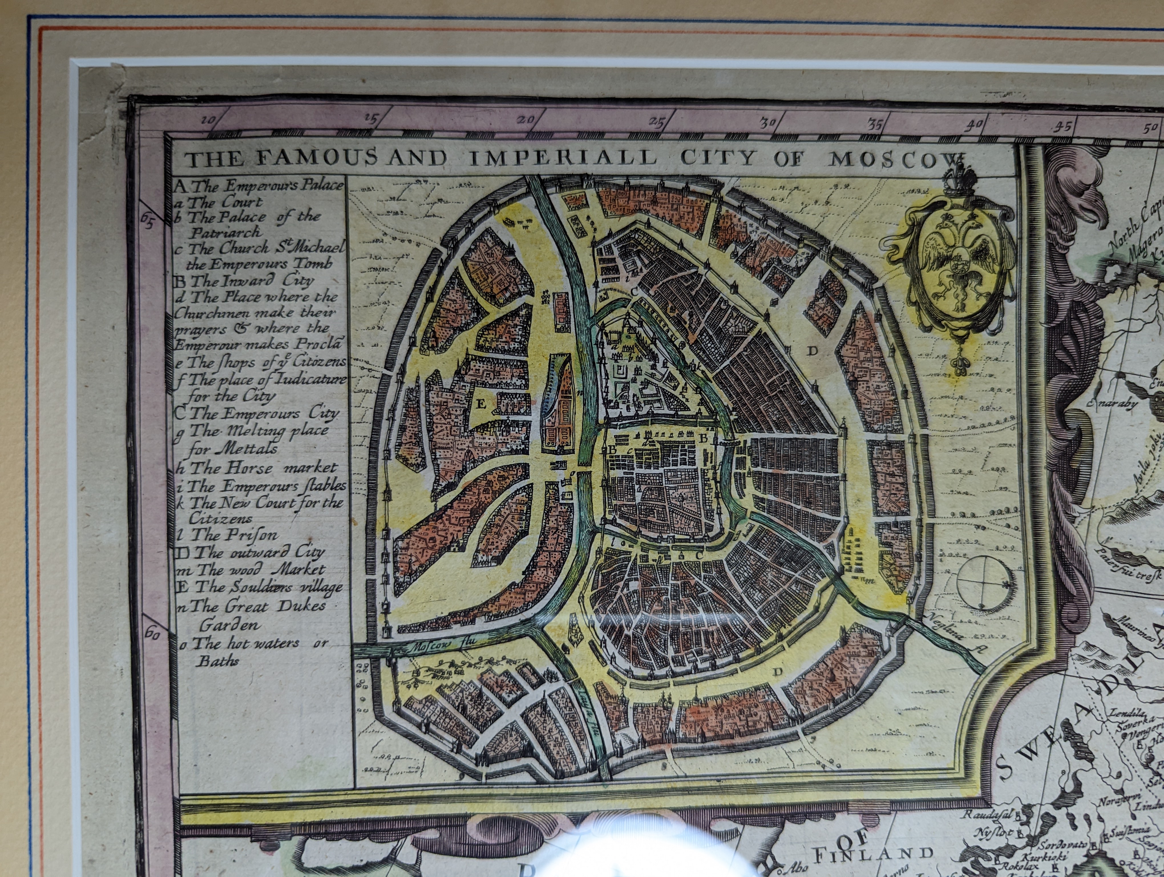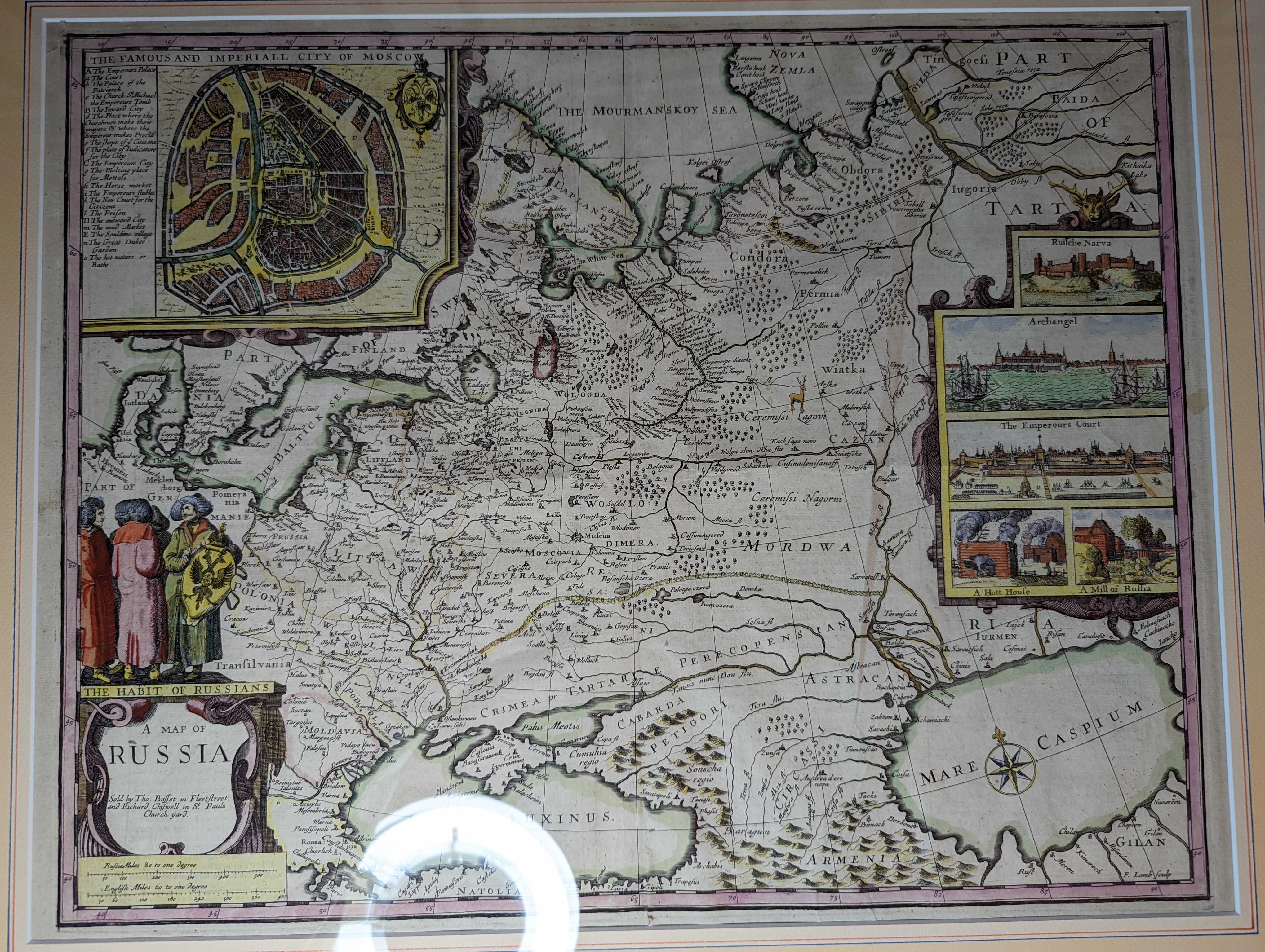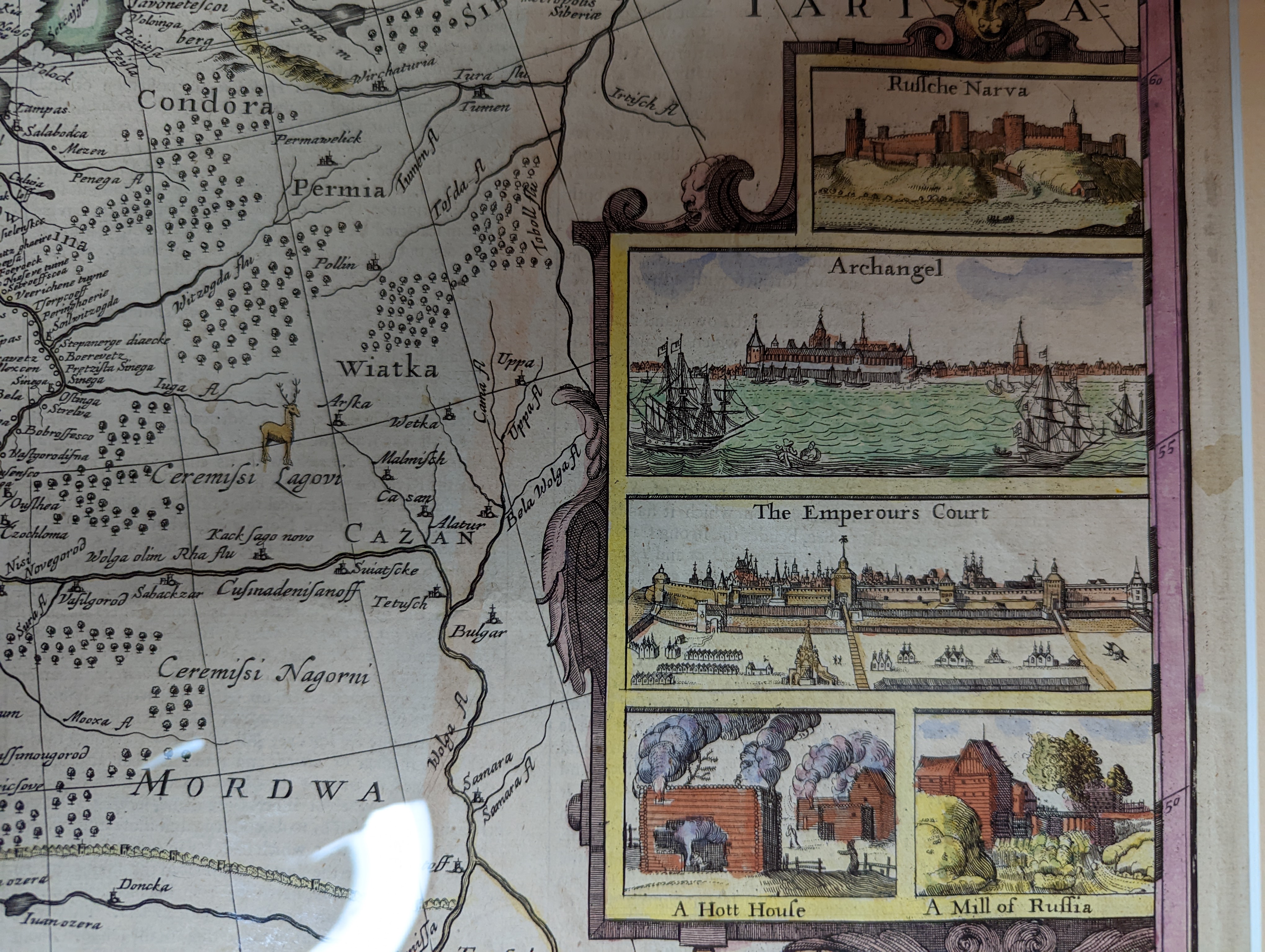 5 insets, Moscow (Braun and Hogenberg) , Russiche Narva, Archangel, The Emperours Court, a Hott House, a Mill of Russia