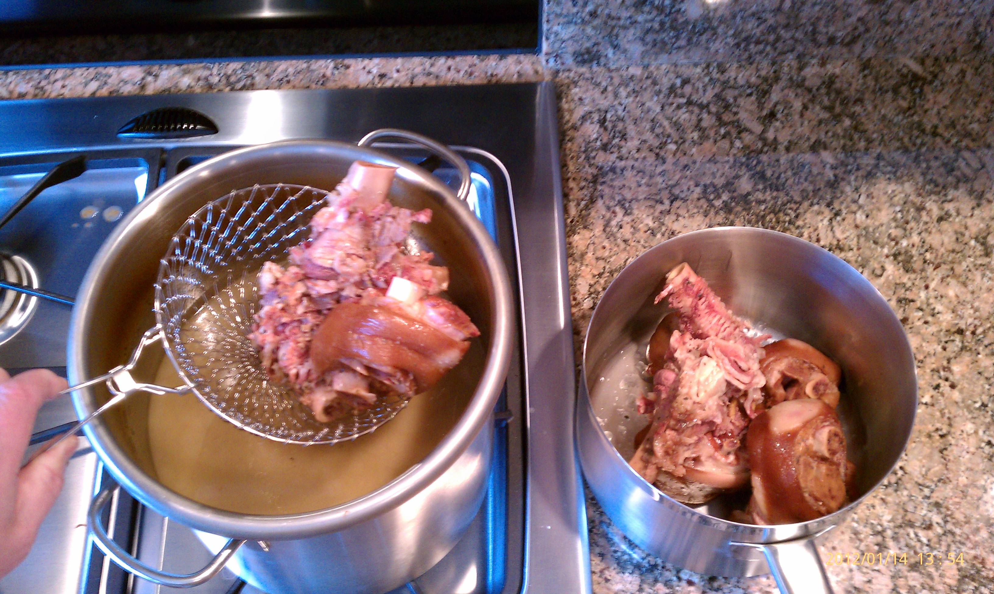 Day of: Place second batch of ingredients in a second large 9 Qt covered stock pot on a high flame. Bring to boil. Move pot into 275 degree oven. Simmer meat for 2+ hours, remove from oven and remove meat to cool.