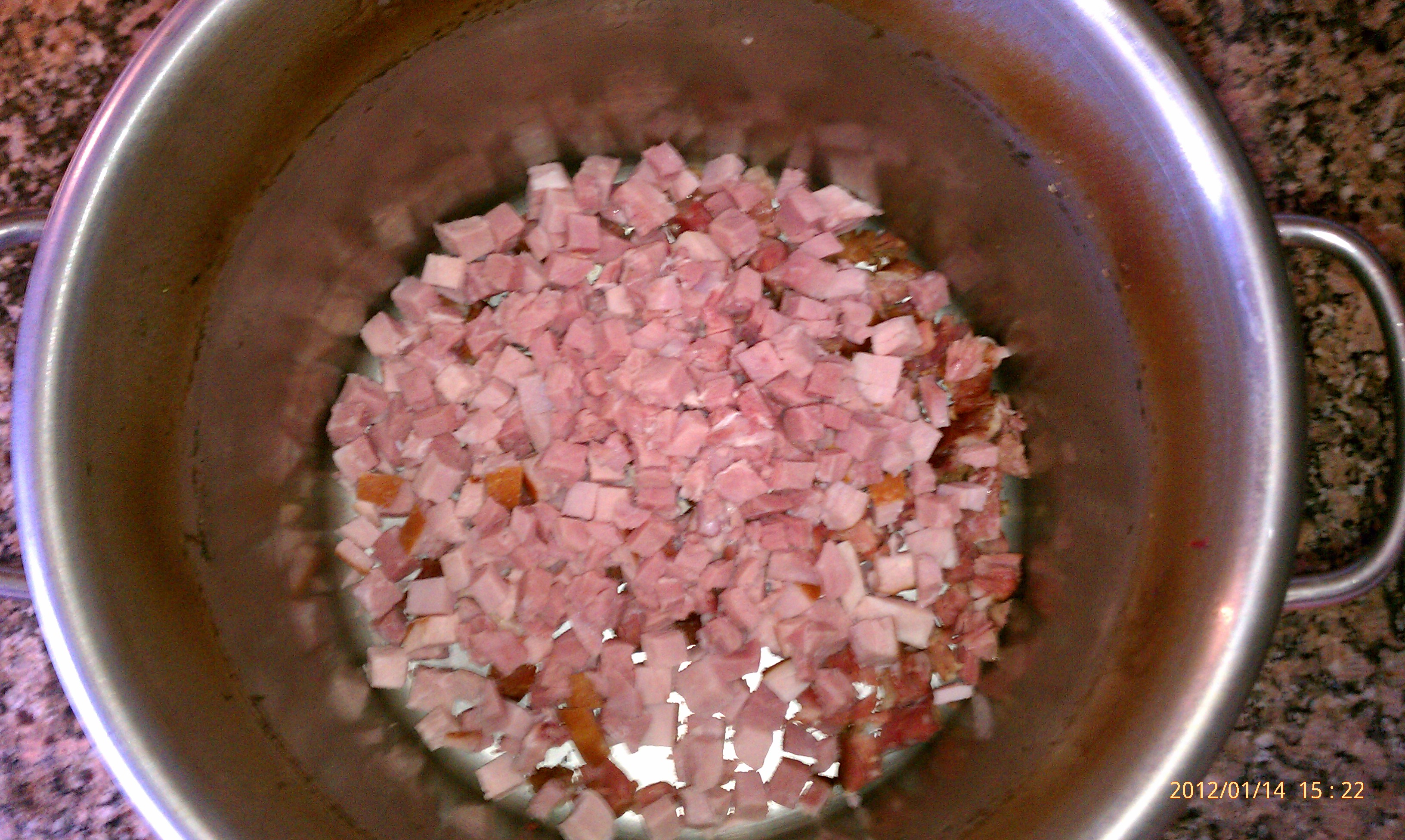 Strain stock and reserve. Discard solids. If doing day in advance, chill stock and remove floating layer of fat. Pick meat from bones and cut into small bite size pieces. Discard bones. Drain soaked beans and return to the larger pot. Add gleaned meat and ham.