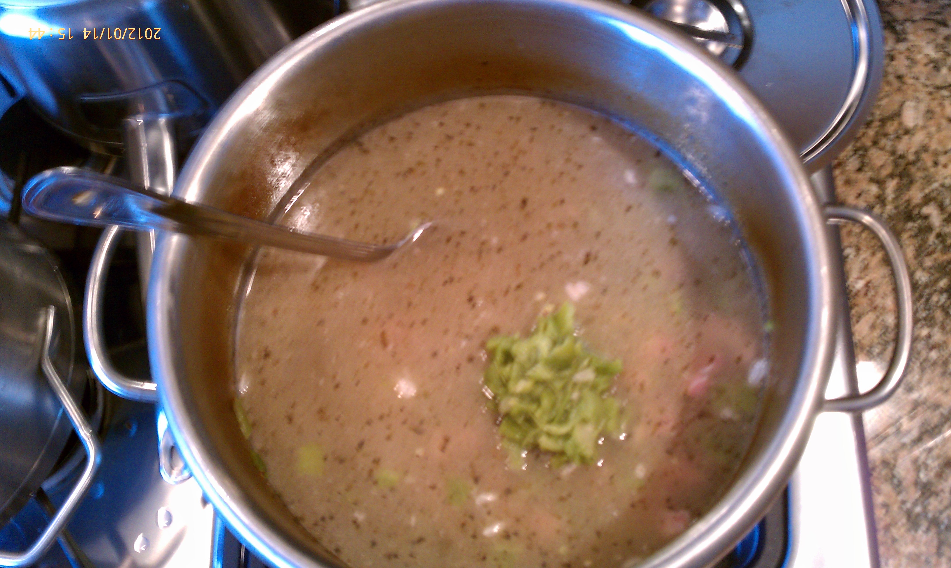 Add 4 Qts. of reserved stock and water or at least enough to cover. (NO salt) Optional: Add 1-2 pounds of peeled and chopped mild green chilis depending on how hot they are.